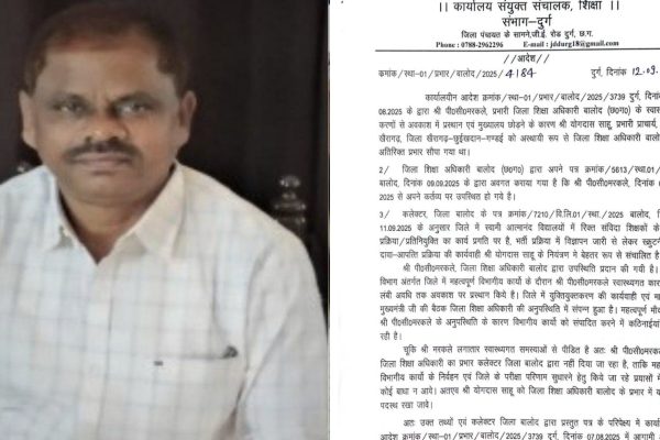 दुर्ग/बालोद। शिक्षा विभाग में लगातार स्वास्थ्यगत कारणों से अवकाश पर रहने वाले जिला शिक्षा अधिकारी पी.सी. मरकले को अब प्रभार से मुक्त कर दिया गया है। शुक्रवार को दुर्ग संभाग के संयुक्त संचालक (शिक्षा) आर.एल. ठाकुर ने नया आदेश जारी करते हुए स्पष्ट किया कि बालोद जिले की जिम्मेदारी फिलहाल योगदास साहू, प्रभारी प्राचार्य डाइट…