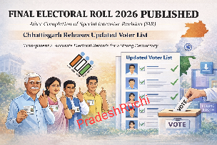 रायपुर।छत्तीसगढ़ में विशेष गहन पुनरीक्षण (एसआईआर) प्रक्रिया पूर्ण होने के बाद 1 जनवरी 2026 की अर्हता तिथि के आधार पर प्रदेश के सभी 33 जिलों में मतदाता सूची का अंतिम प्रकाशन कर दिया गया है। मुख्य निर्वाचन पदाधिकारी कार्यालय द्वारा जारी जानकारी के अनुसार 21 फरवरी 2026 को प्रकाशित अंतिम निर्वाचक नामावली में कुल…
