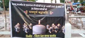 पहलगाम आतंकी हमले पर जिला प्रेस क्लब के अध्यक्ष संतोष साहू ने कहा, यह एक निंदनीय घटना है। हम पीड़ित परिवारों के प्रति अपनी संवेदना व्यक्त करते हैं। हम विश्वास करते हैं कि भारत सरकार, हमारे वीर सेना के जवान हर ऐसा संभव प्रयास करेगी कि ऐसी घटना दोबारा न हो सके और देश के नागरिक सदैव सुरक्षित रहें। पूरा देश एक साथ आतंकवाद के खिलाफ संघर्ष के लिए खड़ा है। जिला प्रेस क्लब के महासचिव राहुल भूतड़ा व संरक्षक दास मानिकपुरी ने कहा कि भारत में रह रही देश विरोधी ताकतों पर भी कड़ी कार्रवाई होनी चाहिए। हमले में स्थानीय लोगों का इंवॉल्वमेंट रहा है, उन्हें भी सजा मिलनी चाहिए।पत्रकारों ने कहा कि इस आतंकी घटना के विरोध में देश एकजुट है. आतंकवादियों को पनाह दे रहे देश पर कार्रवाई होनी चाहिए।कठोर जवाब देना चाहिए।श्रद्धांजलि सभा में जिला प्रेस क्लब के संरक्षक मोहन दास मानिकपुरी, रमन टूवानी ,अध्यक्ष संतोष साहू,महासचिव राहुल भूतड़ा,अरुण उपाध्याय, रवि भूतड़ा, सतीश रजक,विकास साहू,संजय सोनी,करण सोनी, मीनू साहू,परस साहू, नरेश श्रीवास्तव,ऋषभ सिन्हा, देवेंद्र साहू,मनीष साहू सहित अधिवक्ता धीरज उपाध्याय सहित नगर के गणमान्य नागरिक प्रभाकर जैन,अंचल साहू, संतोष शर्मा,वैभव शर्मा,कुलदीप यादव, सुमित शर्मा, संजय शर्मा ,,समीर खान,,,कमल बजाज,,शामिल रहे।