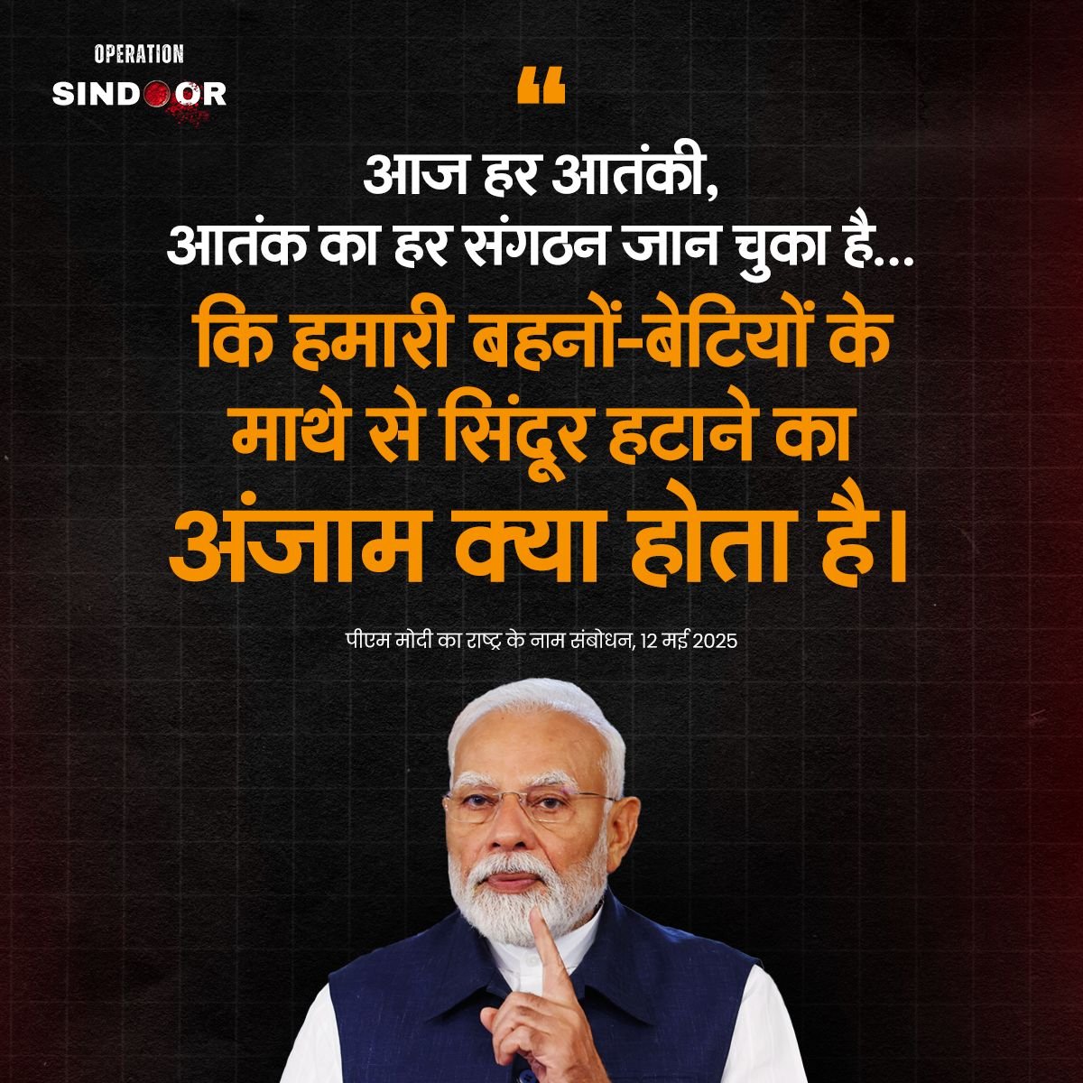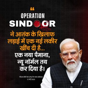 प्रधानमंत्री नरेंद्र मोदी ने आज राष्ट्र को संबोधित करते हुए ‘ऑपरेशन सिंदूर’ की सफलता पर देशवासियों को बधाई दी और इसे भारत की आतंक के खिलाफ निर्णायक नीति का प्रतीक बताया। उन्होंने स्पष्ट किया कि अब आतंक पर भारत का रुख बदल चुका है – “सर्जिकल स्ट्राइक और एयर स्ट्राइक के बाद, अब ऑपरेशन सिंदूर भारत की नई नीति है।”