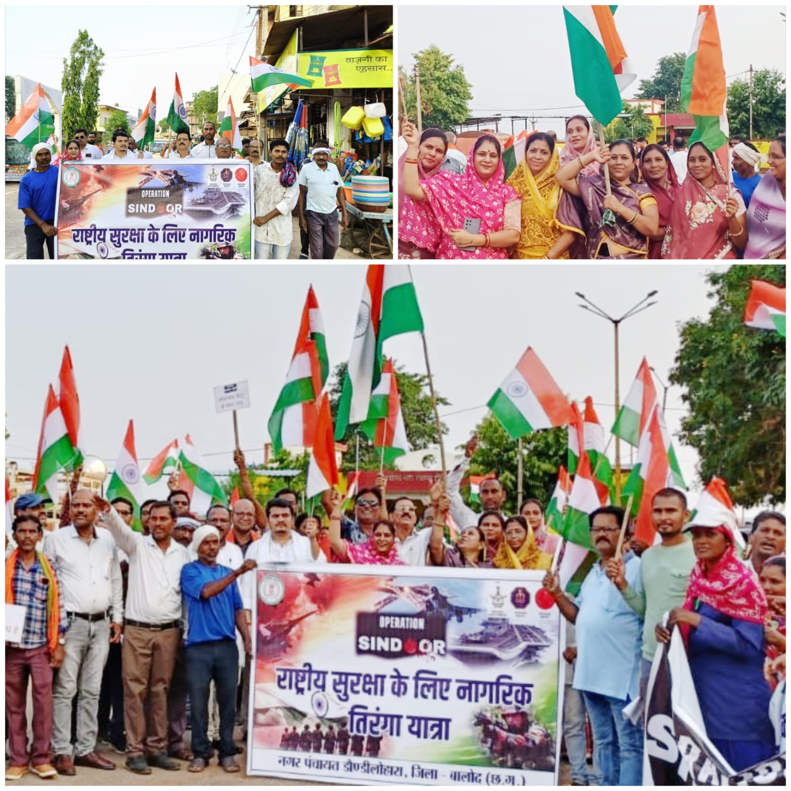 डोंडी लोहारा, भारत माता की जय और वंदे मातरम् के गगनभेदी नारों से आज डोंडी लोहारा की गलियाँ गूंज उठीं जब देश के वीर सैनिकों के सम्मान में भव्य तिरंगा यात्रा का आयोजन किया गया। ‘ऑपरेशन सिंदूर’ में आतंकियों के खिलाफ सैनिकों की अद्वितीय वीरता और साहस को नमन करते हुए नगर पंचायत डोंडी लोहारा सहित क्षेत्र के विभिन्न गांवों एवं कस्बों में यह तिरंगा यात्रा आयोजित की गई।