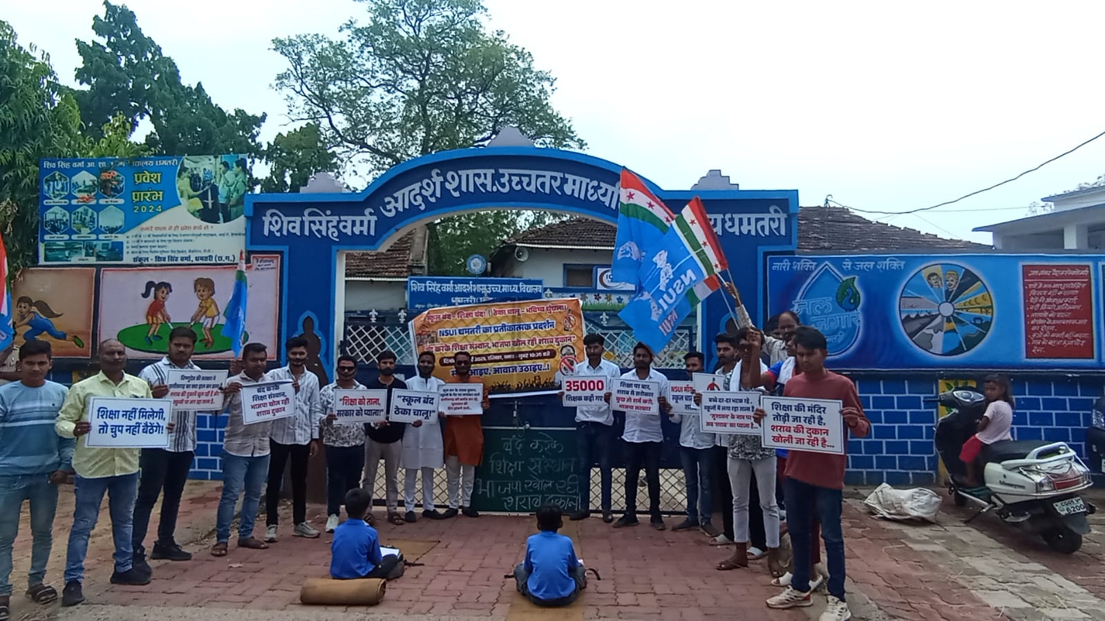 धमतरी।प्रदेश में 4000 शासकीय स्कूलों को बंद करने के सरकार के फैसले और दूसरी ओर 67 नई शराब दुकानों के खोले जाने की घोषणा को लेकर छत्तीसगढ़ में युवाओं का आक्रोश फूट पड़ा है। रविवार को एनएसयूआई ने धमतरी के शासकीय आदर्श उच्चतर माध्यमिक विद्यालय के सामने एक अनोखा और प्रतीकात्मक विरोध प्रदर्शन किया, जिसमें सरकार की नीतियों को कठघरे में खड़ा किया गया।