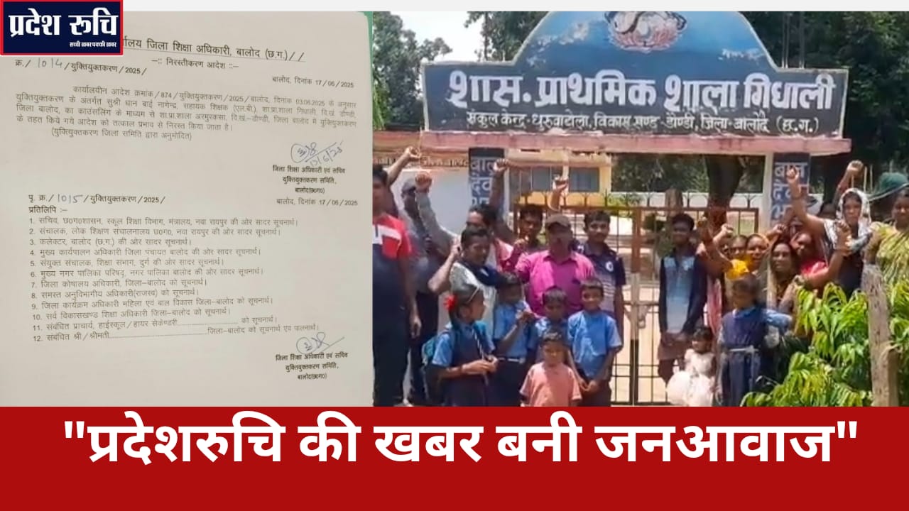 बालोद। गिधाली गांव के स्कूल में शिक्षकों की कमी और अनुचित युक्तियुक्तकरण के खिलाफ ग्रामीणों द्वारा की गई तालाबंदी का प्रदेशरुचि की खबर के बाद बड़ा असर हुआ है। जिला शिक्षा अधिकारी एवं युक्तियुक्तकरण समिति के सचिव ने तत्काल संज्ञान लेते हुए महिला सहायक शिक्षिका धान बाई नागेन्द्र के तबादले का आदेश निरस्त कर दिया है।