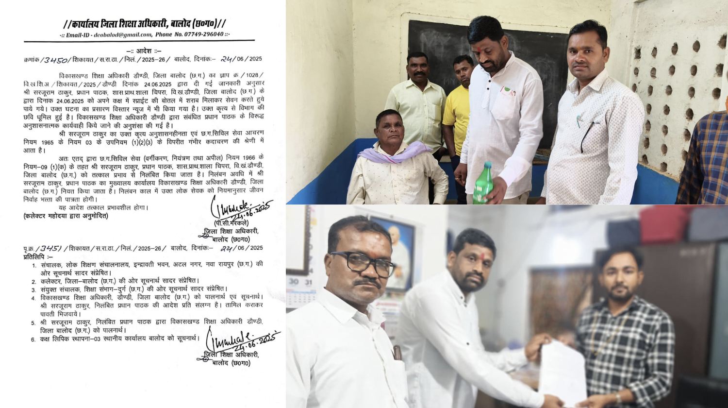 जिला शिक्षा अधिकारी मरकले ने जानकारी देते हुए बताया कि 24 जून 2025 को सरजूराम ठाकुर अपने शासकीय कक्ष में स्प्राइट की बोतल में शराब मिलाकर उसका सेवन करते पाए गए। यह कृत्य न केवल शैक्षणिक मर्यादा के खिलाफ है, बल्कि छत्तीसगढ़ सिविल सेवा आचरण नियम 1965 के तहत गंभीर कदाचरण की श्रेणी में आता है।