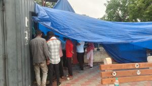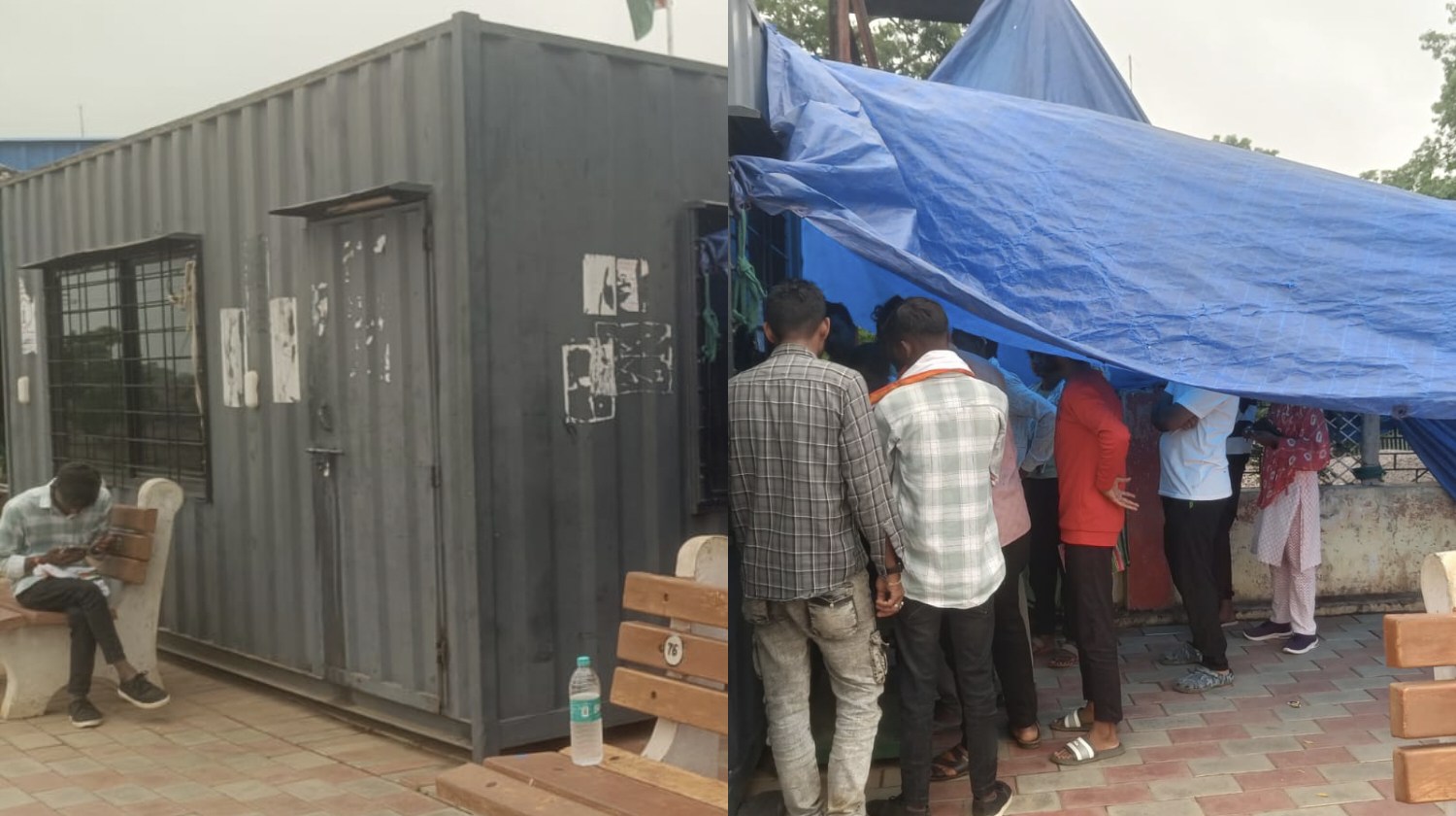 मानसून की बारिश शुरू हो चुकी है। स्टेशन के टिकट काउंटर पर अस्थायी तिरपाल के नीचे लोग घंटों लाइन में खड़े होकर टिकट लेने को मजबूर हैं। छाते और पॉलिथीन के सहारे खुद को बचाते हुए यात्री रेल सेवाओं की उम्मीद कर रहे हैं। कई यात्रियों ने कहा कि अगर अस्थायी इंतजाम भी ठीक से हो जाए तो कम से कम राहत मिले।