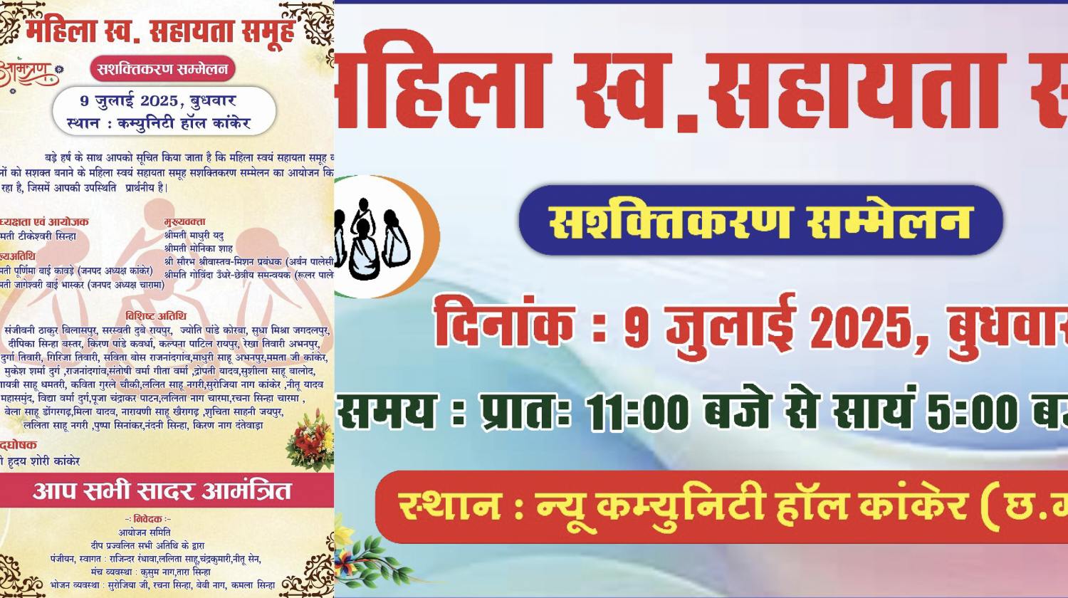 कांकेर | जिले की महिला स्व सहायता समूहों को सशक्त बनाने और उन्हें शासन की योजनाओं से जोड़ने के उद्देश्य से 9 जुलाई, बुधवार को कांकेर के कम्युनिटी हॉल में एक दिवसीय सशक्तिकरण सम्मेलन आयोजित किया जा रहा है। कार्यक्रम की सभी तैयारियाँ पूरी कर ली गई हैं, जिसमें कांकेर जिलेभर सहित अन्य जिलों से हजारों की संख्या में महिला समूहों की बहनों की भागीदारी सुनिश्चित की गई है।