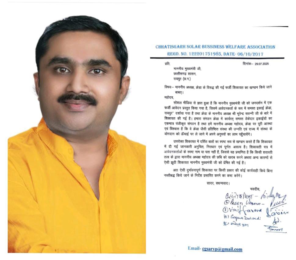 छत्तीसगढ़ सोलर बिजनेस वेलफेयर एसोसिएशन ने भी हुए फर्जी शिकायत का विरोध कर अपने पत्र के माध्यम से खानदान भी किया है और यह भी बताया है कि छत्तीसगढ़ में एक ही रजिस्टर्ड संगठन संस्था है और हमारे द्वारा कोई भी शिकायत नहीं की गई है लिखित तौर पर मुख्यमंत्री श्री विष्णु देव साय के नाम ज्ञापन भी दिया है