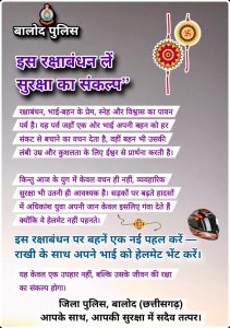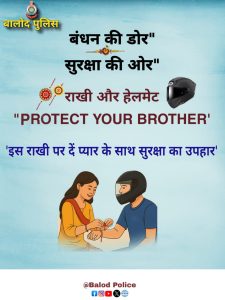 बालोद पुलिस ने एक भावनात्मक पोस्टर जारी कर बहनों से अपील की है कि वे केवल रक्षा-सूत्र न बांधें, बल्कि हेलमेट को ‘सुरक्षा सूत्र’ मानते हुए भाई को गिफ्ट करें। यह न सिर्फ एक प्रतीकात्मक तोहफा होगा, बल्कि यह हर दिन उसकी रक्षा में मददगार साबित हो सकता है।