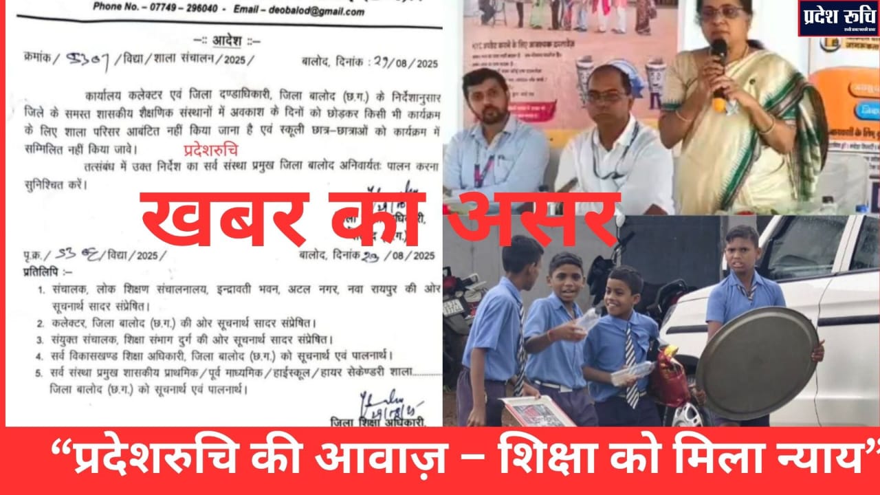 प्रदेशरुचि न्यूज़ की रिपोर्ट का बड़ा असर हुआ है। स्कूली समय में गैर-शैक्षणिक आयोजनों में बच्चों को जबरन शामिल करने और पढ़ाई पर पड़ रहे नकारात्मक प्रभाव को लेकर हमारी खबर सामने आने के बाद प्रशासन हरकत में आया।