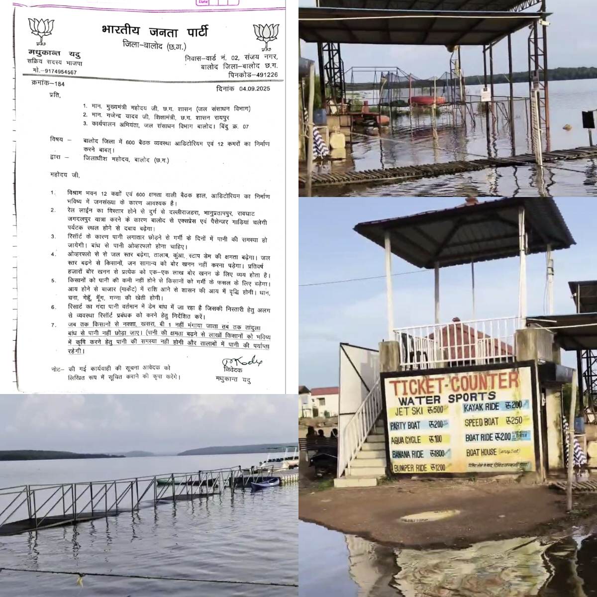ज्ञापन में आरोप लगाया गया है कि रिसॉर्ट का गंदा पानी सीधे जलाशय में पहुँच रहा है। यदु ने मांग की है कि रिसॉर्ट प्रबंधन को निस्तारी हेतु अलग व्यवस्था करने के निर्देश दिए जाएँ। जब तक किसानों से नक्शा, खसरा, बी-1 नहीं मंगाए जाते, तब तक जलाशय से पानी न छोड़ा जाए।