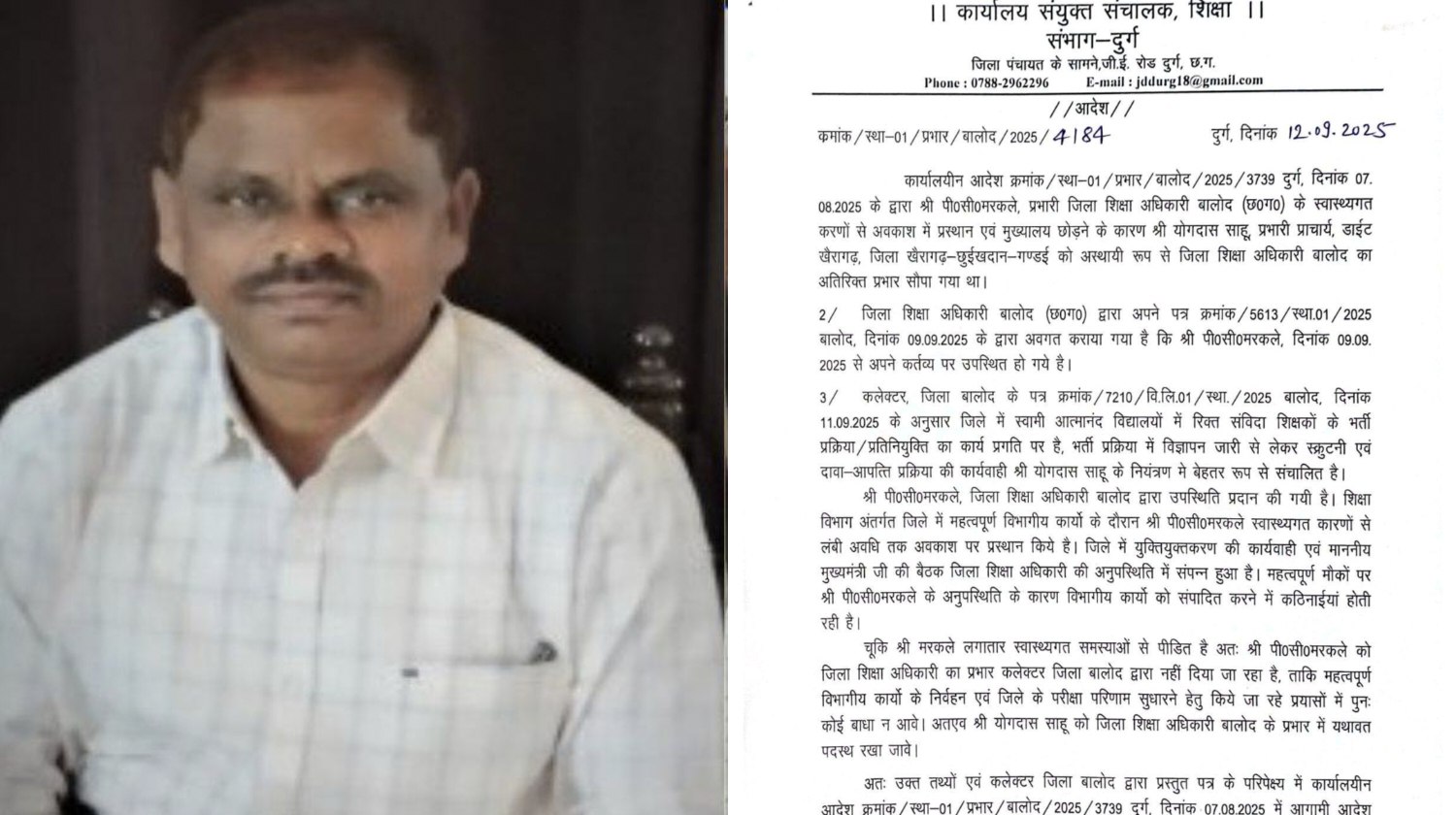 कार्यालयीन आदेश में कहा गया है कि डीईओ मरकले 9 सितंबर को ड्यूटी पर लौट आए थे, लेकिन पिछले लम्बे समय से उनकी लगातार अनुपस्थिति के चलते विभागीय कार्यों पर असर पड़ा है। मुख्यमंत्री की बैठक सहित कई महत्वपूर्ण अवसरों पर उनकी गैरमौजूदगी के कारण जिला स्तर के निर्णय प्रभावित हुए।