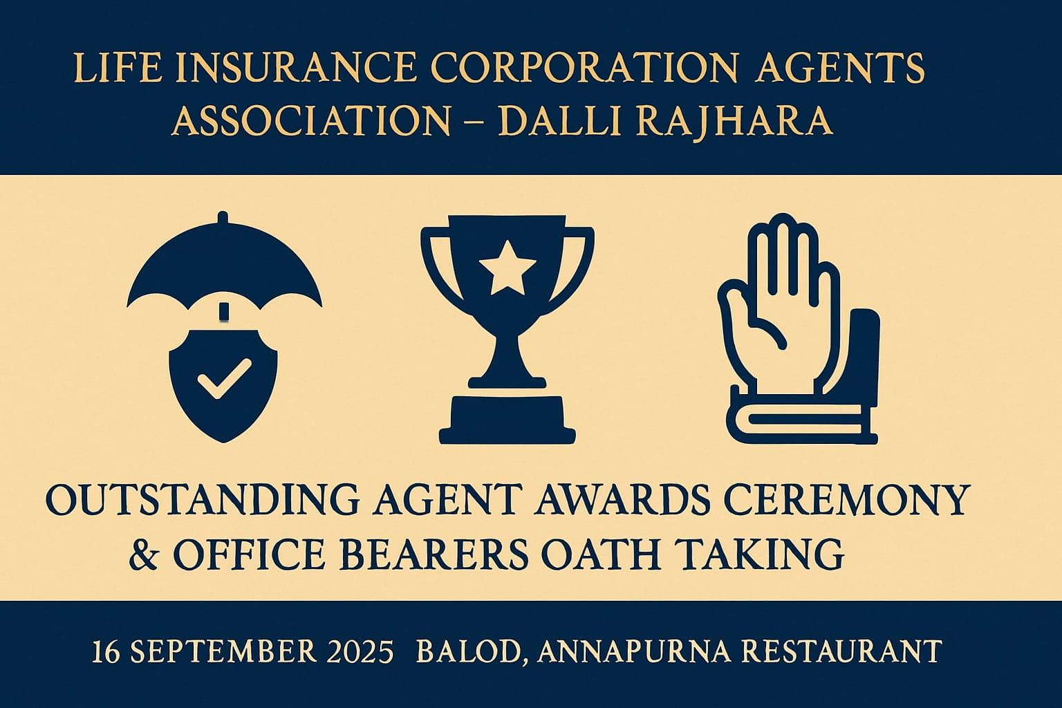 बालोद – भारतीय जीवन बीमा निगम अभिकर्ता संघ, दल्ली राजहरा, 16 सितंबर 2025 को बालोद में एक भव्य “उत्कृष्ट अभिकर्ता सम्मान समारोह एवं शपथ ग्रहण कार्यक्रम” का आयोजन कर रहा है। यह आयोजन बालोद के न्यू बस स्टैंड स्थित अन्नपूर्णा रेस्टोरेंट में सुबह 10 बजे से शुरू होगा, जिसमें पूरे जिले के एलआईसी अभिकर्ता शामिल होंगे।
