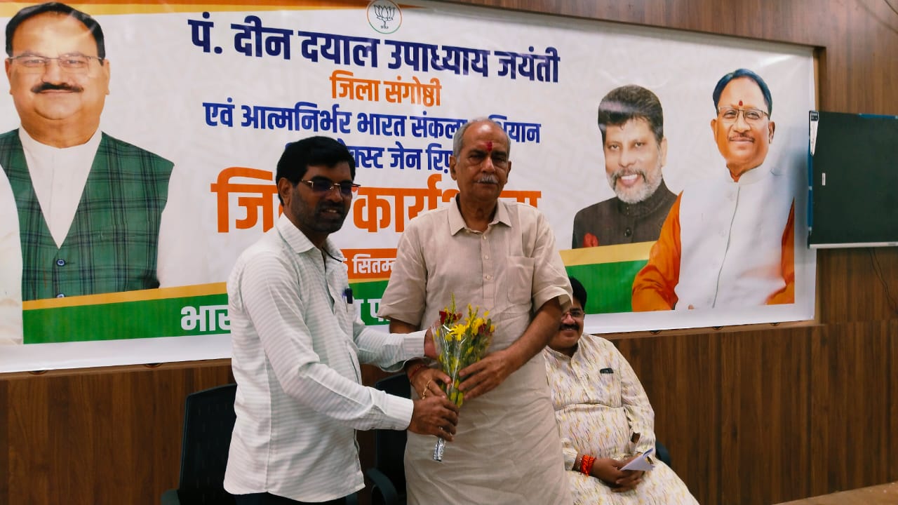 जिला अध्यक्ष चेमन देशमुख ने अपने स्वागत उद्बोधन में सभी कार्यकर्ताओं का आभार जताते हुए कहा कि पार्टी के हर कार्यक्रम को जमीनी स्तर तक सफलतापूर्वक पहुंचाया जा रहा है। उन्होंने पंडित दीनदयाल उपाध्याय को श्रद्धांजलि अर्पित करते हुए उनके एकात्म मानववाद, बौद्धिक प्रखरता और राष्ट्र निर्माण के विचारों को याद किया।आत्मनिर्भर भारत और जीएसटी पर मंथनधमतरी के महापौर जगदीश रामू रोहरा ने आत्मनिर्भर भारत और जीएसटी सुधारों पर अपनी बात रखी। उन्होंने कहा कि कांग्रेस सरकार ने जीएसटी पर केवल बातें कीं, लेकिन इसे लागू करने का साहस प्रधानमंत्री नरेंद्र मोदी ने दिखाया। उन्होंने कहा, “वित्त मंत्री निर्मला सीतारमण ने जीएसटी में बदलाव कर आम जनता से लेकर व्यापारियों तक को राहत दी है। टैक्स दरों को 28% से घटाकर 18% और 12% से 5% तक लाना एक बड़ा कदम है।”रोहरा ने बताया कि 25 सितंबर से 25 दिसंबर 2025 तक “आत्मनिर्भर भारत संकल्प अभियान” चलाया जाएगा, जिसका उद्देश्य हर नागरिक को स्वदेशी उत्पादों के उपयोग और स्वदेशी जीवन मूल्यों को अपनाने के लिए प्रेरित करना है। उन्होंने ‘गो वोकल फॉर लोकल’ अभियान को दुर्गा पूजा और गरबा महोत्सवों के माध्यम से जन-जन तक पहुंचाने का सुझाव दिया।