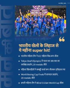 – महिला ब्लाइंड क्रिकेट टीम द्वारा बिना एक भी मैच हारे विश्व कप जीतना—इसे उन्होंने “भारतीय खेल इतिहास की सबसे प्रेरक जीतों में से एक” बताया।