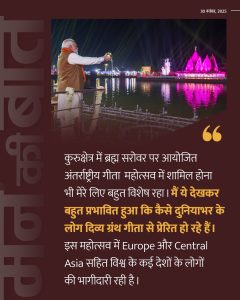 प्रधानमंत्री ने कहा कि कुरुक्षेत्र के महाभारत अनुभव केंद्र में 3D और डिजिटल तकनीक से महाभारत को जीवंत किया गया है। ब्रह्मसरोवर पर आयोजित अंतरराष्ट्रीय गीता महोत्सव में दुनियाभर की भागीदारी को उन्होंने भारत की आध्यात्मिक शक्ति करार दिया।