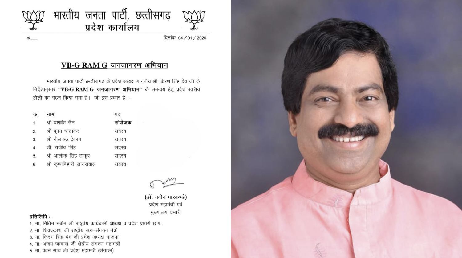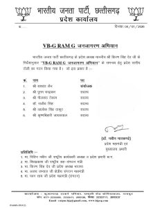 प्रदेश भाजपा द्वारा जारी पत्र के अनुसार, इस अभियान के प्रभावी संचालन और समन्वय के लिए गठित टीम में पूनम चन्द्राकर, नीलकंठ टेकाम, डॉ. राजीव सिंह, आलोक सिंह ठाकुर और कृष्णबिहारी जायसवाल को सदस्य बनाया गया है। यह अभियान केंद्र सरकार की उस महत्वपूर्ण पहल से जुड़ा है, जिसे मनरेगा के स्थान पर लाए गए नए बिल के रूप में देखा जा रहा है और जिसके उद्देश्यों, प्रावधानों व लाभों को आमजन तक पहुंचाने के लिए भाजपा देशभर में जागरूकता अभियान चला रही है।