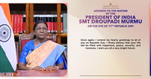 नई दिल्ली। गणतंत्र दिवस की पूर्व संध्या पर राष्ट्रपति द्रौपदी मुर्मु ने राष्ट्र के नाम अपने संबोधन में देशवासियों को गणतंत्र दिवस की शुभकामनाएं दीं और भारत की लोकतांत्रिक यात्रा, एकता, विकास और आत्मनिर्भरता पर विस्तार से बात रखी।