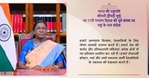 अपने संदेश के अंत में राष्ट्रपति ने देशवासियों से ‘राष्ट्र प्रथम’ की भावना के साथ कार्य करने का आह्वान किया और कहा कि विकसित भारत का निर्माण हम सभी की साझा जिम्मेदारी है। उन्होंने एक बार फिर सभी नागरिकों को गणतंत्र दिवस की शुभकामनाएं देते हुए सुख, शांति और समृद्ध भविष्य की कामना की।