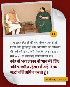 24 फरवरी को पूर्व मुख्यमंत्री J. Jayalalithaa की जयंती का उल्लेख करते हुए प्रधानमंत्री ने उन्हें श्रद्धांजलि दी। उन्होंने कहा कि तमिलनाडु में कानून-व्यवस्था, महिला सशक्तिकरण और सुशासन के क्षेत्र में उनके प्रयास आज भी याद किए जाते हैं।