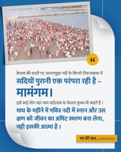 प्रधानमंत्री ने पिछले वर्ष के महाकुंभ की स्मृतियों को याद करते हुए कहा कि आस्था की वही धारा दक्षिण में भी प्रवाहित होती है। केरल के तिरुनावाया में भारतप्पुझा नदी के तट पर ‘मामंगम’ या ‘केरल कुंभ’ का आयोजन सदियों पुरानी परंपरा का पुनर्जागरण है।