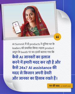 पहला उदाहरण अमूल के स्टॉल से जुड़ा था, जहां बताया गया कि कैसे AI तकनीक पशुओं के इलाज, डेयरी प्रबंधन और 24×7 डिजिटल सहायता के जरिए किसानों की मदद कर रही है। दूसरा उदाहरण भारतीय संस्कृति से जुड़ा था, जिसमें प्राचीन ग्रंथों और पांडुलिपियों को आधुनिक तकनीक के जरिए संरक्षित और अनुवादित करने की प्रक्रिया दिखाई गई।