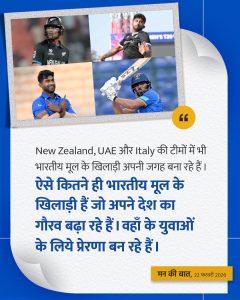 प्रधानमंत्री ने T-20 वर्ल्ड कप का जिक्र करते हुए भारतीय मूल के खिलाड़ियों की उपलब्धियों पर गर्व जताया। उन्होंने बताया कि कनाडा टीम के कप्तान दिलप्रीत बाजवा, नवनीत धालीवाल और अन्य खिलाड़ी भारतीय मूल से जुड़े हैं। अमेरिका टीम के कप्तान मोनांक पटेल सहित कई खिलाड़ी भारत में घरेलू क्रिकेट खेल चुके हैं। ओमान, न्यूजीलैंड, यूएई और इटली की टीमों में भी भारतीय मूल के खिलाड़ी अपनी पहचान बना रहे हैं। उन्होंने कहा कि भारतीय जहां भी जाते हैं, अपनी जड़ों से जुड़े रहते हैं और जिस देश में रहते हैं, उसके विकास में योगदान देते हैं।