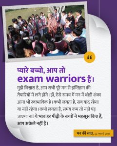 प्रधानमंत्री ने परीक्षा दे रहे विद्यार्थियों को ‘एग्जाम वॉरियर्स’ बताते हुए कहा कि अंकों से ज्यादा महत्वपूर्ण प्रयास और आत्मविश्वास है। उन्होंने विद्यार्थियों से तनावमुक्त होकर परीक्षा देने और माता-पिता व शिक्षकों से संवाद बनाए रखने की सलाह दी।