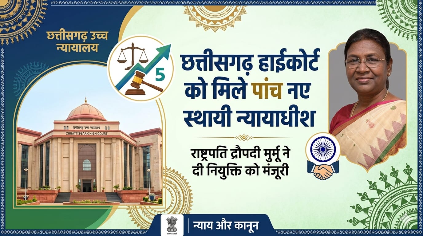 छत्तीसगढ़ हाईकोर्ट को मिले पांच स्थायी न्यायाधीश, राष्ट्रपति ने दी नियुक्ति को मंजूरी